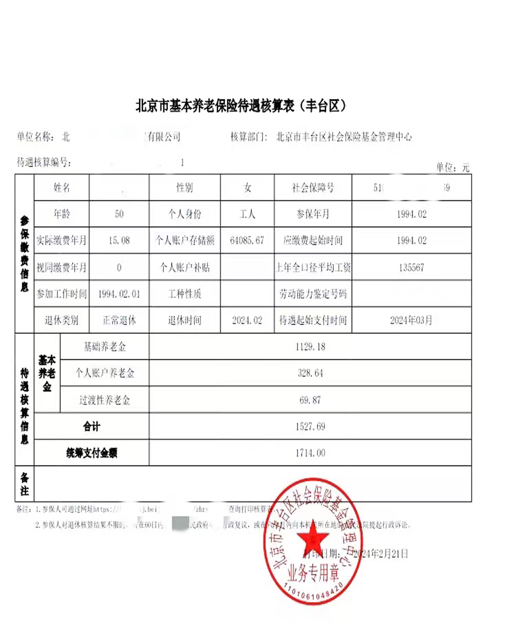 合计:1129.18+328.64+69.87=1527.69元 低于北京最低养老金,所以按1714发放。